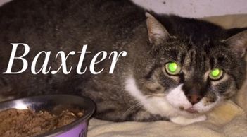 BAXTER is a short-hair male with lovely coloring and markings and sports a very pretty white bib. Baxter is a very nervous cat but is slowly becoming approachable.